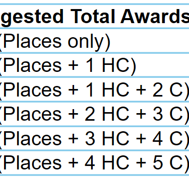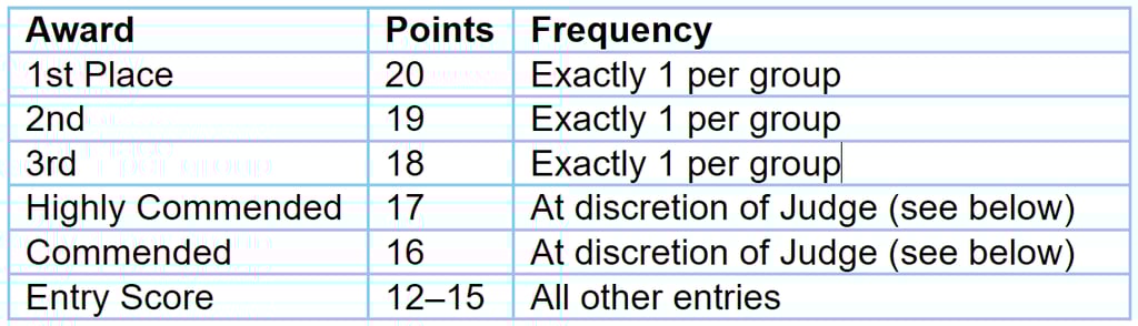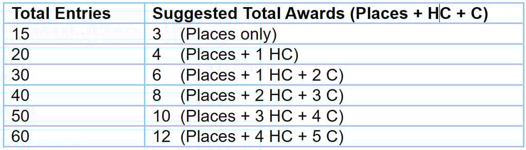 The Society use a points-based league system. While the number of awards is at the Judges discretion, the Committee have agreed that total awards (Places + HC + C) should not exceed approx. 20% of the entries in each group.